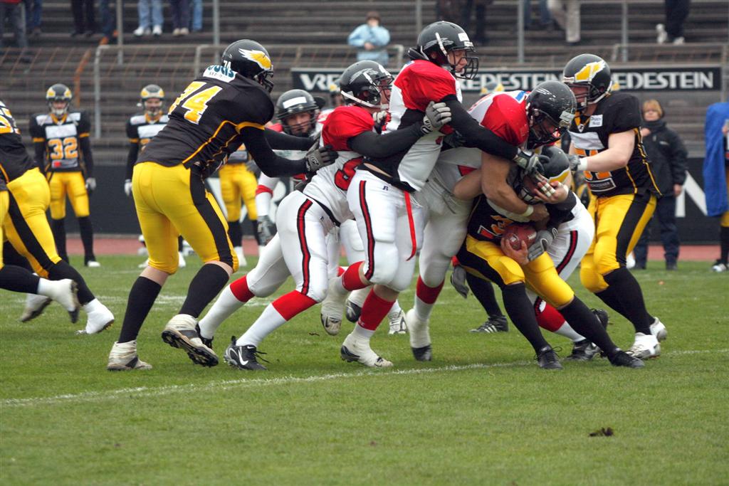 Anekdote am Rande: Nur wenige Kilometer entfernt spielt zur gleichen Zeit wie die Falcons der vermeintliche Gruppensieger der GFL 2 Nord, die Assindia Cardinals bei den Berlin Rebels. Im Fall eines Sieges würden die Essener als Zweitligameister und damit Gegner der Falcons in der Relegation feststehen.