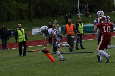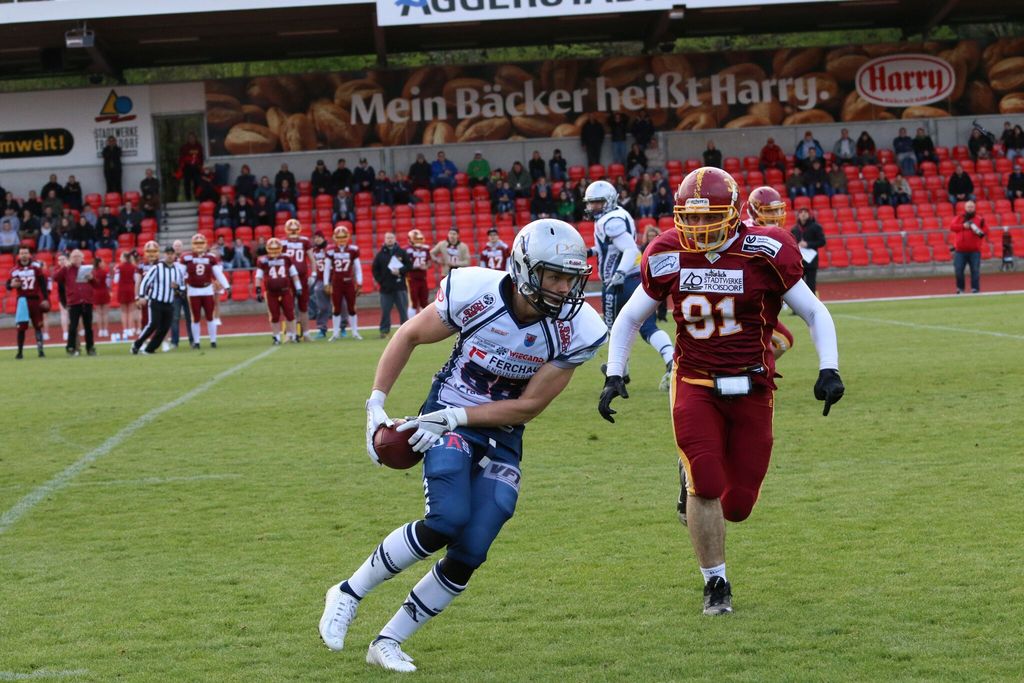 Der Amboss hatte zur Pause also berechtigte Hoffnung ins Spiel zurückfinden zu können. Doch ein Interception tief in der eigenen Hälfte läutete ein wildes drittes Viertel ein. Spätestens jetzt machte sich aber auch der verletzungsbedingte Ausfall von Defense-Kapitän Clemens Riecke bemerkbar, der sich Mitte des zweiten Viertels eine Knieverletzung zugezogen hatte und nicht wieder aufs Spielfeld zurückkehren konnte. Ohne den Linebacker fand die Amboss-Defense nur noch wenig Mittel, um das Laufspiel über Troisdorfs Bürling einzudämmen.