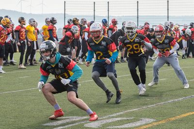Wie ein Fanfarenzug läuft die große Spielertraube durch das Eingangstor des Trainingsplatzes. Ihre Trikots sind entweder schwarz oder rot, nur die Quarterbacks haben gelbe Shirts an. Ein farbliches Sammelsurium besteht beim Trainingscamp der deutschen Nationalmannschaft nur bei den Helmen. Die weißen Unicorns-Helme sind zu sehen, auch von anderen bekannten Teams aus der GFL-Süd wie die Munich Cowboys, Marburg Mercenaries oder den Razorbacks aus Ravensburg sind Spieler gekommen. Rund 120 Akteure aus ganz Süddeutschland haben ihre Visitenkarte an diesem Samstag auf dem Kunstrasenfeld am Schulzentrum West abgegeben – darunter 16 Akteure der Unicorns. Bereits vor zwei Wochen gab es ein vergleichbares Trainingscamp für die Spieler aus Norddeutschland in Braunschweig.
