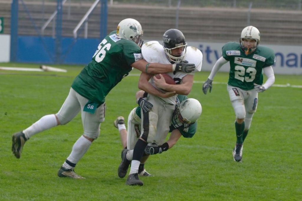 Interceptions Jens Thomsen, Will Skultety). Die Kieler Defense Line und die Linebacker unterbanden konsequent das Berliner Laufspiel und beide Units setzten den Berliner Quarterback ständig unter Druck. Bestes Beispiel war ein Quarterback-Sack im vierten Versuch von Chris Moskal, der einen Offense-Drive der Rebels beendete. Die Defense verschaffte somit der eigenen Offense immer wieder genügend Zeit und gute