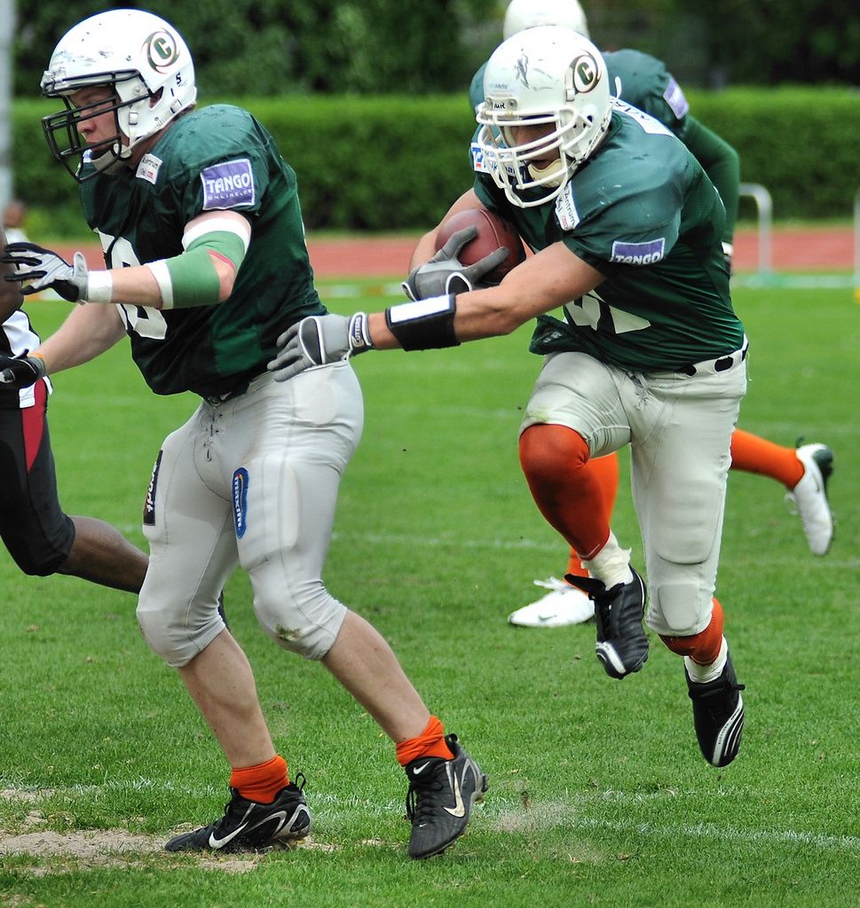Das gefürchtete Laufspiel der Generäle aus Göttingen wurde durch eine variable und kompromisslose Defense im Keim erstickt. Lediglich zum Ende einer jeden Halbzeit wurde auf eine passorientierte Formation umgestellt, die es den Generals ermöglichte durch Reversespielzüge großen Raumgewinn zu verzeichnen. Gut, dass es in den Kieler Reihen Spieler wie Christian Baumann gibt, die alle Sinne beisammen hielten und in letzter Sekunde Punkte für den Gegner verhindern konnten. Selbst im letzen Quarter als einige Rookies die Stammspieler ersetzen stand die Null am Ende des Tages. Ganz am Anfang des Tages stand jedoch Daniel Lindenthal im Mittelpunkt, der den etatmäßigen Kicker Tim Kohl blendend ersetzte. 5 min vor dem Kickoff stand fest, dass Tim Kohl an diesem Tag nicht kicken würde können und ersetzt werden musste. Das Vertrauen in seine Person rechtfertigte Daniel Lindenthal mit den ersten drei Punkten des Spiels durch eine 34 Yard Fieldgoal. Die Kieler Offense tat sich bis zur Halbzeit schwerer. Läufe wurden von der Göttinger Defense schnell gestoppt und bei den Pässen fehlte die letzte Konsequenz beim Zupacken. Wie bereits am vergangenen Wochenende, als Kampgeist der Schlüssel zum Erfolg war, kämpfte sich auch an diesem Wochenende die Offense zurück ins Spiel und spielte furios auf. Zwei Touschdownpässe durch Rookie Quarterback Fynn Hansohm, einmal auf Daniel Boensch und einmal auf Supertalent Derik Posdorfer über 42 Yards, markierten den verdienten Endstand von 16:0 für die Kieler Wirbelstürme. Rookie Martin Gyamfi fasste auf der Rückfahrt im Bus durchs Mikrofon die Kieler Stimmungen gut zusammen. Nach einer derartigen Vorrunde, gegen übermächtige Gegner, in der Abstiegsrunde mit dieser Moral und diesem Teamgeist zu bestehen ist bemerkenswert. Sicherlich das wichtigste und eindrucksvollste Ergebnis dieser chaotischen Regionalligasaison 2010 aus Kieler Sicht. Mit dem Sieg in Göttingen finden sich die Kieler derzeit auf dem ersten Platz der Abstiegsrunde wieder. Eigentlich ein Ergebnis, dass zwei Spieltage vorm Ende der Saison beruhigen sollte. Dennoch wird nun weiter konzentriert gearbeitet den ersten Tabellenplatz zu sichern. Überraschungen bei der Zusammensetzung der Ligen sind wir gewohnt und ich kann mir nicht vorstellen, dass die Verantwortlichen einen Ersten der Abstiegsrunde durch eine Ligareform absteigen lassen sagt HC David Barg, deshalb kann unser Ziel nur sein die beiden Rückspiele gegen Hannover und Göttingen zu gewinnen.