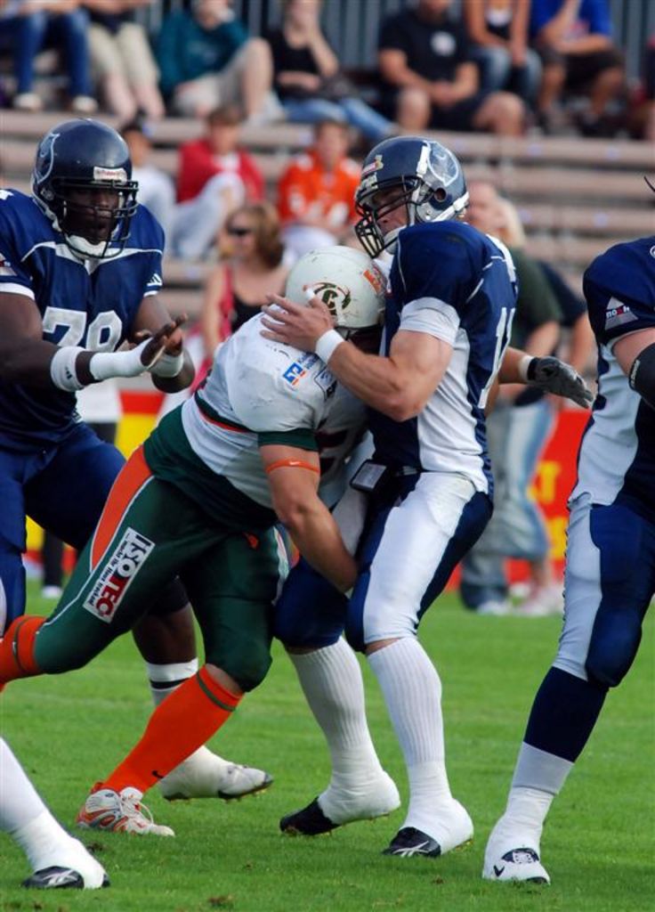 Was nach dem Touchdown der Canes bis zur Halbzeit folgte, waren insgesamt sieben Ballbesitze, die kein Team in Punkte umsetzen konnte. Die Blue Devils verließen sich an diesem Tag primär auf das Passspiel und häufig standen vier Wide Receiver auf dem Platz. Quarterback Josh Brehm kam in der Endabrechnung auf 54 Passversuche, von denen er 29 anbringen konnte. Auf Kieler Seite kam Adrian Rainbow bei 20 Versuchen auf 15 erfolgreiche Pässe. Betrachtet man die Statistik, so hatten die Blue Devils wohl einen gewissen Vorteil an diesem Tag. Aber die Statistik ist halt immer nur die halbe Wahrheit. Die Canes Defense ließ an diesem Tag nur wenige Big Plays. Über die Kurz- und Mitteldistanz kamen die Devils zu Erfolgen, aber es reichte nur selten für längere Pässe. Seinen besten Tag im Canes-Trikot hatte ausgerechnet ein Hamburger erwischt. Linebacker Neil Sintim-Aboagye, ansonsten Starter als Outside Linebacker, vertrat an diesem Tag Middle Linebacker John Van Look auf der Position des Middle Linebackers. Das Fehlen von John in diesem Spiel hat uns schon etwas nervös gemacht, berichtete Canes Head Coach Kent Anderson nach dem Spiel. John ist eigentlich kaum zu ersetzen, aber Neil hat es an diesem Tag eindrucksvoll geschafft. Der ehemalige Spieler der Hamburg Eagles kam an diesem Tag auf insgesamt 15 Tackles, von denen viele unter dem Begriff Highlights einzusortieren sind. Neben Sintim-Aboagye konnten sich auch Defense End Christopher Rieck, Linebacker Robert Koster und Defense Back Greg LeFever, der extra für das Spiel eingereist war, mit gekonnten Aktionen auszeichnen. In der Offense kam erstmals in dieser Saison Running Back Sascha Gerasimov zum Einsatz.