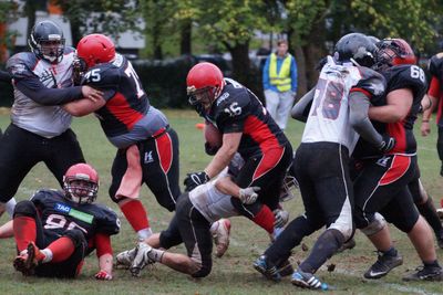 Am Ende behielten die Hausherren mit 15:6 (0:0/0:0/15:0/0:6) die Oberhand. Der Regen machte das Spiel zunächst alles andere als einfach. Beide Teams mühten sich, aber die jeweiligen Defense-Reihen behielten die Kontrolle. Die erste Chance auf Punkte ergab sich so erst am Anfang des zweiten Viertels. Die Chemnitz Crusaders waren bis in Field-Goal-Reichweite gelangt, doch der Versuch von Kicker René Steiniger (#28) ging an der falschen Seite der Torstangen vorbei. In der Folge wechselte das Angriffsrecht munter hin und her - sei es durch Punt oder aber auch durch eine Interception der Erkneraner Defense. Eine Chance auf Punkte hatte jedoch kein Team.
