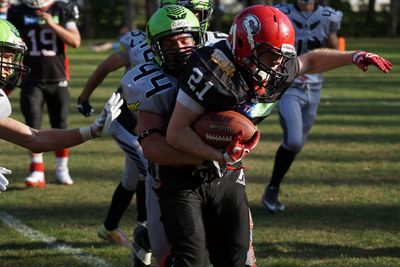 Eine in Summe eher schwache Offenseleistung konnte beim 8:10 (0:7/0:0/0:3/8:0) gegen die Leipzig Hawks die Niederlage nicht verhindern. Dabei war die Offense der Gäste keinesfalls stärker gewesen. Letztlich brachte ein unglücklicher Fehler im Special Team die Chemnitzer ins Hintertreffen, was im Verlauf des Spiels nicht egalisiert werden konnte. Doch der Reihe nach. Sehr schnell war zu bemerken, dass die Defensereihen das Spiel bestimmen würden. Keine Seite konnte sich in der Offense genug entfalten. Immer wieder beendeten Punts die Angriffsserien. So geschah es auch kurz vor Ende des ersten Viertels. Punter René Steiniger (#28) stand kurz vor der eigenen Endzone bereit, bekam einen sehr schlechten Snap, versuchte noch zu retten was zu retten war, der Ball flog los - doch in die Arme eines Gegenspielers, der nur noch wenige Meter zum Touchdown zurückzulegen hatte - mit 0:7 gingen die Leipziger in Führung. Das Turnover-Spielchen ging weiter - entweder durch Punt oder auch die eine Interception der Leipziger Defense. Schließlich waren die Gäste einmal bis in Field-Goal-Reichweite gelangt, doch der Versuch ging fehl. Ein kleines Highlight gelang nun noch der Offense der Chemnitz Crusaders - Quarterback Vincent Kahle (#84) warf einen Pass auf Wide Receiver Patrick Fitzgerald (#7), der kam einige Yards voran - doch danach war die Spielzeit ausgelaufen ...