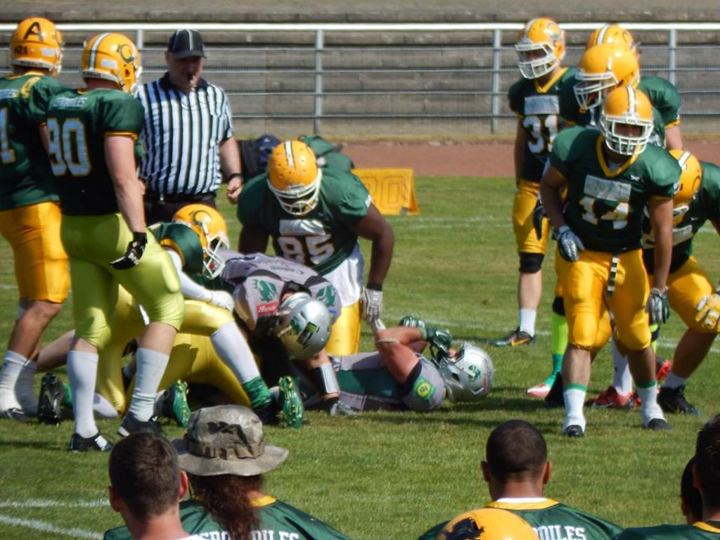 Dabei fing das Spiel denkbar schlecht für die Hausherren an. Nach nervösem Beginn in der Offense konnte Bielefeld bereits mit dem ersten Ballbesitz punkten und mit 7:0 in Führung gehen. Auch danach spielten nur die Bulldogs, vor allem über ihre beiden Amerikaner, QB Isiah Grimes und WR E.J. Drewery. So erzielten die Bulldogs schnell ein Fieldgoal, danach aber spielten bis zur Halbzeit nur noch die Crocodiles. Offense Coordinator Allan Verbraeken trieb seine Spieler mit variablem Pass- und Laufspiel nach vorne, sodass folgerichtig auch die Crocodiles zu ihrem ersten Touchdown durch Estrus Crayton kamen. Jordan Glass konnte direkt im Anschluss den QB in der Endzone zu Fall bringen und so weitere 2 Punkte auf das Scoreboard bringen. Dies bezeichnet man im Football wohl als das berühmte Change of Momentum, auch im Anschluss brachten die Bulldogs keinen Fuß mehr auf die Erde, wohingegen die Domstädter wiederum postwendend durch Daniel Teubert und Lionel Denis zwei Touchdowns zum Halbzeitstand von 23:10 erzielten.