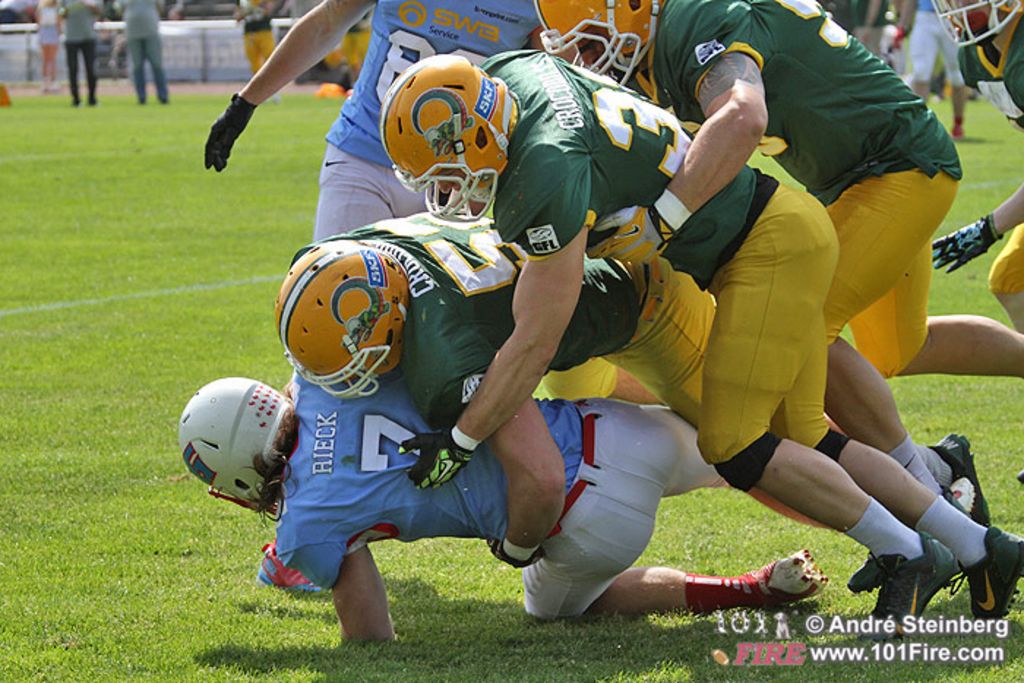 Bereits im ersten Quarter konnten die Crocodiles mit 15:0 in Führung gehen, ein guter Mix aus Pass und Laufspiel ermöglichte kontinuierlichen Raumgewinn. Die Touchdowns erzielten der an diesem Tage überragende Daniel Teubert, der in 32 Versuchen 220 Yards Raumgewinn erzielen konnte und Denis Dauben über kurze Läufe in die Endzone der Bundesstädter. Die Defense der Heimmannschaft war hellwach und ließ die gegnerische Offense in dieser Phase des Spiels nie zur Entfaltung kommen.