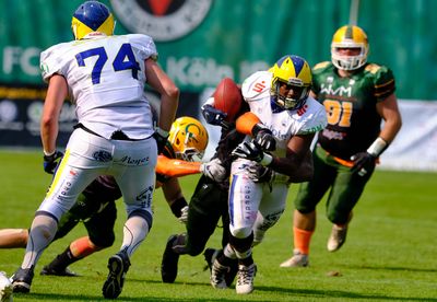 Hatte man noch am letzten Spieltag beim Tabellenvierten in Berlin nach einer starken ersten Halbzeit und einer 3:14 Führung letztendlich mit 43:22 die vermeintlich letzte Chance auf eine wiederholte Play-Off Teilnahme verspielt, zeigte man sich an diesem Wochenende trotzdem angriffslustig. Vor 1.268 Zuschauern im Höhenberger Sportpark präsentierten sich zunächst die tags zuvor frisch gekürten Jugendmeister des U19 Nachwuchses. Mit 57:18 hatten die Jungkrokodile am Samstagabend in Schwäbisch Hall gegen die Wiesbaden Phantoms ihre Perfect Season mit dem fünften Jugendmeistertitel der Vereinsgeschichte gekrönt. Auch die Herren wollten sich nicht einfach ihrem Schicksal ergeben und vor heimischem Publikum gegen den Zweiten der Liga Nord zeigen, dass die vom Verletzungspech verfolgte Saison durchaus anders hätte verlaufen können. Unter dem Motto „Crocodiles tackle Leukemia“ mit einer hervorragend angenommenen DKMS Typisierungsaktion gingen die Hausherren von Beginn an entschlossen zur Sache.