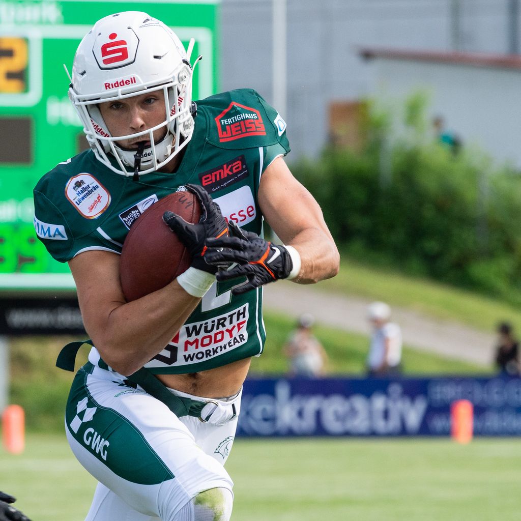 Im zweiten Spielabschnitt trumpften die Gastgeber dann stark auf. Touchdowns von Reilly Hennessey, Tyler Rutenbeck und Mikey Alfieri (alle PAT Stadelmayr) brachten sie mit 35:6 in Führung. Die Angriffsbemühungen der Saarländer wurden von der Haller Defense hingegen dreimal gestoppt. Zweimal durch die zwei Fettig-Interceptions inklusive Returns über 36 und gar über umjubelte 76 Yards.