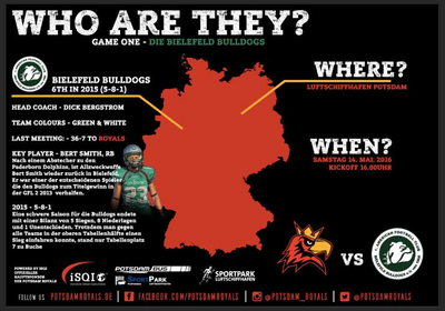 Die Bulldogs haben in der Saison 2016 bereits 2 Spiele absolviert, einer Niederlage gegen Köln folgte ein klarer Sieg gegen den Aufsteiger aus Essen. In Spiel 1 fehlten den Bielefeldern noch die 2 starken amerikanischen Neuzugänge auf der Quarterback- und Linebackerposition. Gegen Essen war deren Einfluss auf das Spielgeschehen dann aber schon deutlich sichtbar. Es erwartet uns also eine spannende Partie!