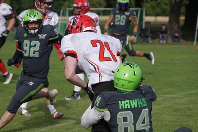 Die Führung wuchs auf 0:14. Wer nun glaubte, dass es einfach so weiter gehen würde, sah sich getäuscht. Leipzig kam besser ins Spiel und schaffte es die Chemnitzer Offense zu stoppen. So war bereits das zweite Viertel angebrochen, als ein kurzer Punt der Gastgeber nun die Tür für die nächsten Punkte öffnete. Quarterback Gerrit Höppner (#7) fand Wide Receiver Niklas Weise (#82) mit einem 27-Yard-Pass zum Touchdown, was sein erster Touchdown überhaupt war. Die Führung wuchs auf 0:21. Die Defense hielt und die Offense punktete weiter - wieder per Pass auf Niklas Weise (#82), den die Defense vollkommen ungedeckt gelassen hatte - neuer Spielstand 0:27. Bei den Leipzig Hawks keimte nun ein Fünkchen Hoffnung auf, als deren Quarterback entwischte und zum Touchdown lief.