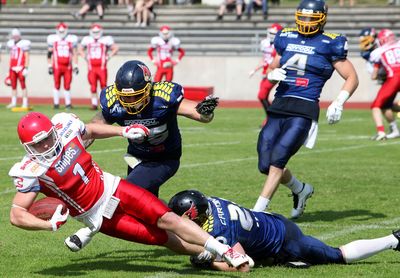 Nach den ersten Punkten des Gegners lief erst einmal wenig zusammen und das Spiel kippte. „Wir finden einfach kein Mittel, um das ganze Spiel fokussiert zu bleiben. Wir fangen halt super an, bekommen unser Spiel auch ganz gut auf den Platz, aber irgendwann findet auch der Gegner eine Aktion um ins Spiel zugelangen, er punktet dann auch und daran zerbrechen wir dann.“ Die 10:0 Führung der Cardinals konnte Lübeck noch in der ersten Hälfte kontern und mit 10:14 in die Pause gehen. Den amerikanischen Runningback hatten die „Men In Blue“ einige Zeit im Griff, doch die starken Aktionen des Importspielers einzuschränken gelang mit fortlaufender Spieldauer immer schlechter. Lübeck kam zu 28 Punkten in Folge, was Coach Yves Thissen richtig verärgerte: „Wir verschenken die Spiele einfach, so wie heute. Es sind wirklich die Fehler bei den Basics, die uns das Genick brechen.“ So rückte am Ende der sehr ordentliche Start in die Begegnung, die Führung aber auch der Versuch sich in das Spiel zurück zu kämpfen in den Hintergrund.