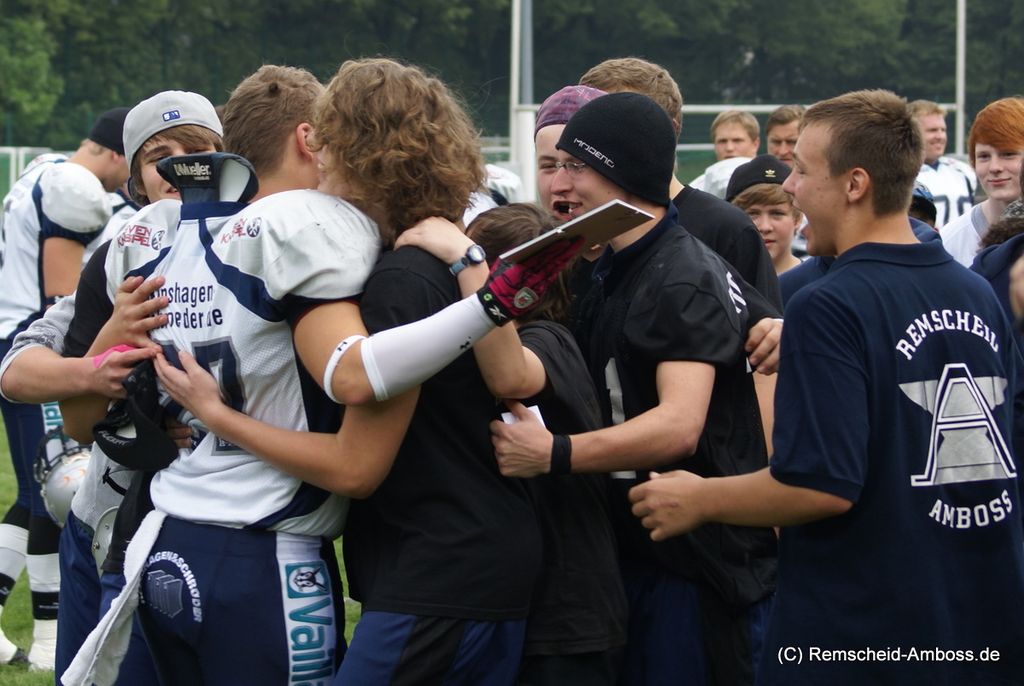 Das Spiel begann intensiv. Endlich waren die Ambosse von der ersten Sekunde hellwach und motiviert bis in die Haarspitzen. Der Kick Off Return von Robin Westhoff wurde erst an der 45 Yardline gestoppt. Oliver Schidzig spielte Quarterback und führte sein Team von Beginn an souverän bis Inches vor die Endzone. Mehrere gute Läufe der Runningbacks Robin Westhoff und Patrick Poetsch bereiteten diesen Weg, um dann durch Patrick Poetsch zum ersten Touch Down vollendet wurde. Den POT vollendete Oliver Schidzig. Damit gelang dem Amboss endlich einmal ein Start ins Spiel, der den Gegner sichtlich beeindruckte. Die Chargers wirkten eingeschüchtert von der Spielweise, die dem Amboss in den letzten Spielen fehlte. Der Drive nach dem Kick Off wurde sofort gestoppt und die Chargers mussten erneut punten. Doch diesen ließ Immanuel Neuschäfer in ungewohnter Manier fallen und die Chargers kamen wieder aufs Feld. Sofort machte Immi seinen Fehler durch eine Interception wieder weg. Auch der nächste Drive der Chargers endete mit Ballverlust. Ein Fumble des Runningbacks konnte durch Carsten Tönnes gesichert werden. Noch eine kuriose Szene zum Ende des 1. Quarters. Runningback Westhoff, gestoppt von 4 Chargers, übergab den Ball an O-Liner Mario Bowe, der nochmals 4 Yards gutmachen konnte. Nun brachten die Runningbacks Westhoff, Poetsch und Mischa Drenge das Ei übers ganze Feld. Doch dann im Gedränge entriss ein Chargerspieler Patrick Poetsch den Ball und konnte erst 30 Yard später gestoppt werden. Dies darf ihm in Amerika nicht passieren. Patrick machte sein vorerst letztes Spiel für den Amboss. Er beginnt ein Studium im Iova Wesleyan Collage.