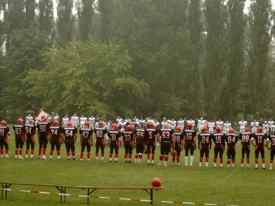 Zum zweiten Teil des Double Headers - dem Hauptevent des Tages - verschlechterten sich die äußeren Bedingungen nochmals durch mal mehr mal weniger starken Nieselregen. Bereits bei der Spielvorbereitung konnte man auf Seiten der Crusaders die eine oder andere Überraschung feststellen. Zuvor angekündigt war ja bereits das Fehlen der beiden Schlüsselspieler Daniel Püngel (QB #7) und Jan Schloßhauer (LB #50). Stattdessen streifte sich Defense Coach Rene König wieder die Ausrüstung über - diesmal mit #94. Für eine weitere kleine Überraschung sorgte dann das Auftauchen der #7 mit einem Helm der Chemnitz Varlets. Darunter verbarg sich allerdings kein Rookie aus dem Varlets-Team, sondern der Offense Coordinator Ralph "Gazelle" Dietrich höchstpersönlich. Anscheinend hatten sich die Coaches vorgenommen, ihre Männer selbst auf dem Feld anzuführen. Das Spiel begann ungewöhnlicherweise nicht dem gewohnten Einlaufprozedere der Crusaders. Vielleicht wollte man ja die Identität der #7 noch etwas vor den Gästen aus Berlin geheim halten. Einer der Schiedsrichter schaute zumindest nicht schlecht ... Die Crusaders begannen das Spiel mit dem Kick Off, so dass die Bears zuerst das Angriffsrecht hatten. Beide Teams neutralisierten sich jedoch weitestgehend. Das Angriffsrecht wechselte stetig hin und her, aber nichts Zählbares wurde dabei erreicht. Anscheinend wollte auch keines der beiden Teams ein zu großes Risiko eingehen, denn in diesem Spiel ging es auch um wichtige Punkte im Kampf um den Klassenerhalt in der Regionalliga Ost. Nach dem Seitenwechsel zu Beginn des zweiten Viertels standen die Crusaders kurz davor, die ersten Punkte zu erzielen. Leider missglückte der Versuch von Mike Pfab (K/P/WR #1), ein Field Goal zu erzielen, nicht zuletzt aufgrund der widrigen Bedingungen. Im weiteren Verlauf des Viertels schafften es die Bears bis kurz vor die Endzone, da der Ballträger ins Aus trat, bevor er in die Endzone kam. Danach verloren sie jedoch durch einen Fumble den Ball und das Angriffsrecht. In dieser Phase erlitt Sascha Schubert (DB #11) eine Verletzung am Auge, wegen der das Spiel für ihn dann beendet war. Gute Besserung auf diesem Wege! In Folge des Fumbles der Bears begannen die Crusaders ihren Drive mit dem heutigen Starting-Quarterback Thomas Sieron (#5) an der eigenen 1-Yard-Linie. Man konnte sich zwar befreien, aber wiederum sprang aufgrund der auslaufenden Uhr nichts Zählbares heraus und es ging mit 0:0 in die Halbzeitpause. Das dritte Viertel schien zunächst eine Fortsetzung des bisherigen Verlaufs des Spiels zu bieten. So machte sich auch langsam Gedanke breit, dass das Team, welches die ersten Punkte erzielt, am Ende auch als Sieger vom Platz geht. Die Bears konnten dann ein ums andere Mal durch Läufe ihrer #3 ordentlich Raumgewinn erzielen. Seinen Läufen konnte die Defense der Crusaders nur bedingt etwas entgegen setzen. So kam es schließlich wie es in einem solchen Spiel kommen musste - die Bears erzielten einen Touchdown. Auch der PAT war gut und so stand es auf einmal 0:7. Noch war nicht aller Tage Abend, aber auch im letzten Viertel wollt enicht sonderlich viel gelingen. Weder ein selbst wieder aufgenommener eigener Punt noch der Auftritt von der "neuen" #7 als Quarterback konnten verhindern, dass die Zeit davon lief und letztendlich die Bears abknien und die Uhr auslaufen lassen konnten. Die Freude auf Seiten der Bears über den ersten Sieg in der Regionalliga Ost war natürlich groß und die Erleichterung spürbar. Den Crusaders fehlen nun jedoch bereits zwei durchaus eingeplante Punkte, was sich am Ende der Saison rächen kann. Somit bleibt nur die Hoffnung, dass mit weiterer kontinuierlicher Arbeit die besonders in den ersten beiden Spielen gegen die Leipzig Lions und die Frankfurt (Oder) Red Cocks gezeigten guten Ansätze sich auch in der Tabelle wiederfinden werden. Bereits am nächsten Wochenende gibt es im Heimspiel gegen die Leipzig Lions die Chance dazu. Dieses Spiel sollte sich jeder Fan der Chemnitz Crusaders dick im Kalender vormerken, denn jede Unterstützung wird benötigt.