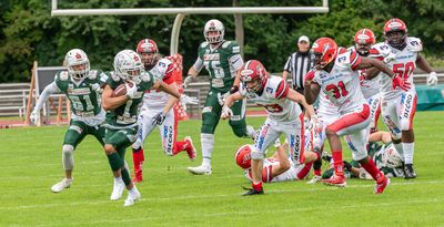 Unterbrochen wurde der Punktereigen der Gäste von einem weiteren Marburger Touchdown zum 13:21, der allerdings der letzte an diesem Tag gewesen sein sollte. „Nachdem wir schnell punkten konnten, ist es der Defense gelungen, den Weg in unsere Endzone zuzumachen“, lobte Neuman die Haller Verteidigung, die auf Cody Pastorino, Corey Chapman sowie weitere Schlüsselspieler verzichten musste, den Mercenaries in der zweiten Hälfte aber nur noch ein Field Goal zugestand.