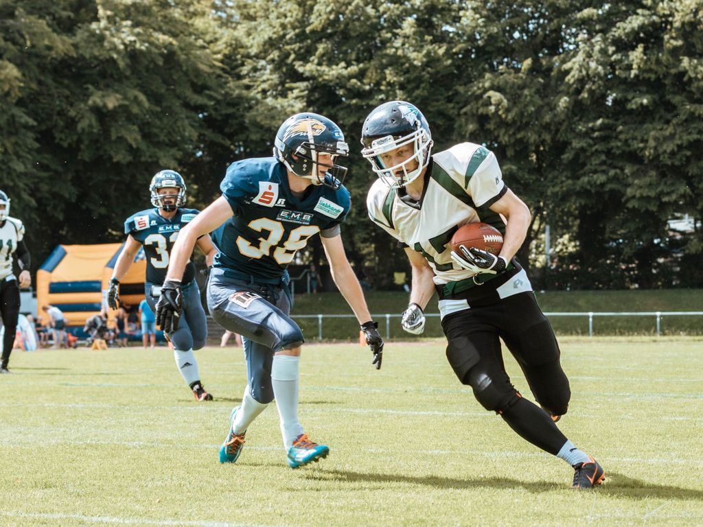 Kurz vor der Halbzeit konnte Linebacker Marvin Schieber einen Pass des Biberacher US-Quarterbacks Michael Van Deripe an der 45-Yard-Linie der Gastgeber abfangen. Die Offensive bekam dadurch eine weitere Chance, die Führung auszubauen und tat dies wenige Spielzüge später in Form eines Field Goals von Jonas Lohmann. Mit dem 17:3 ging es kurz darauf auch in die Pause.