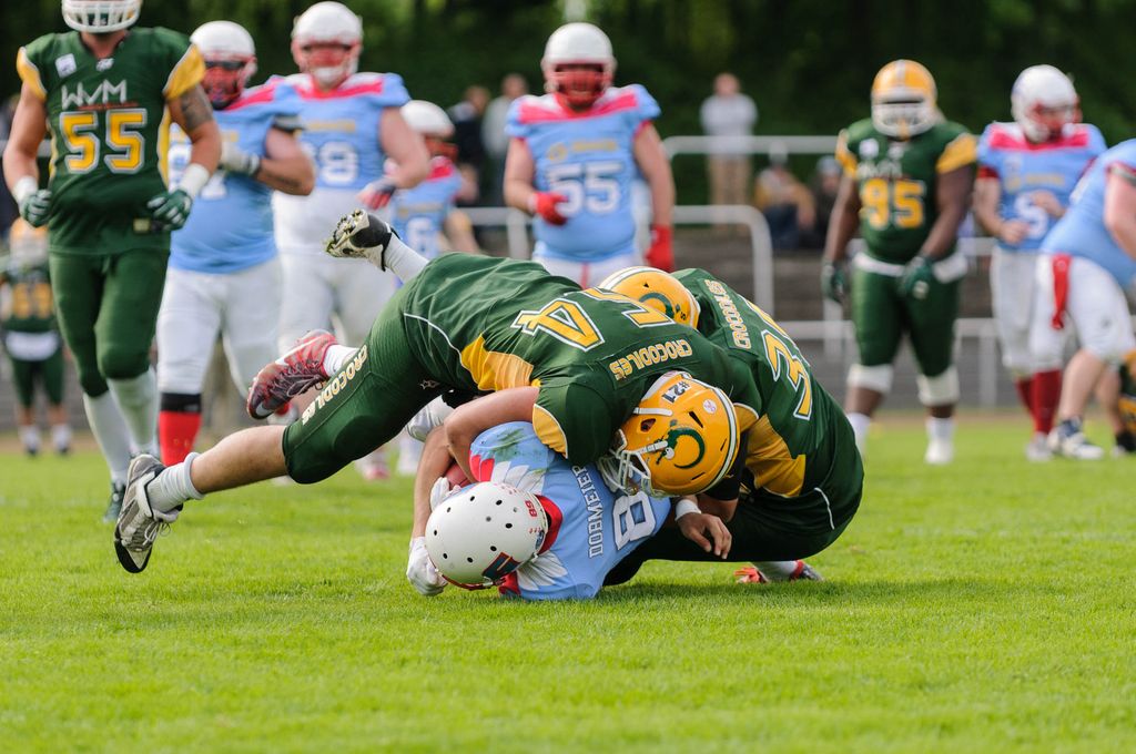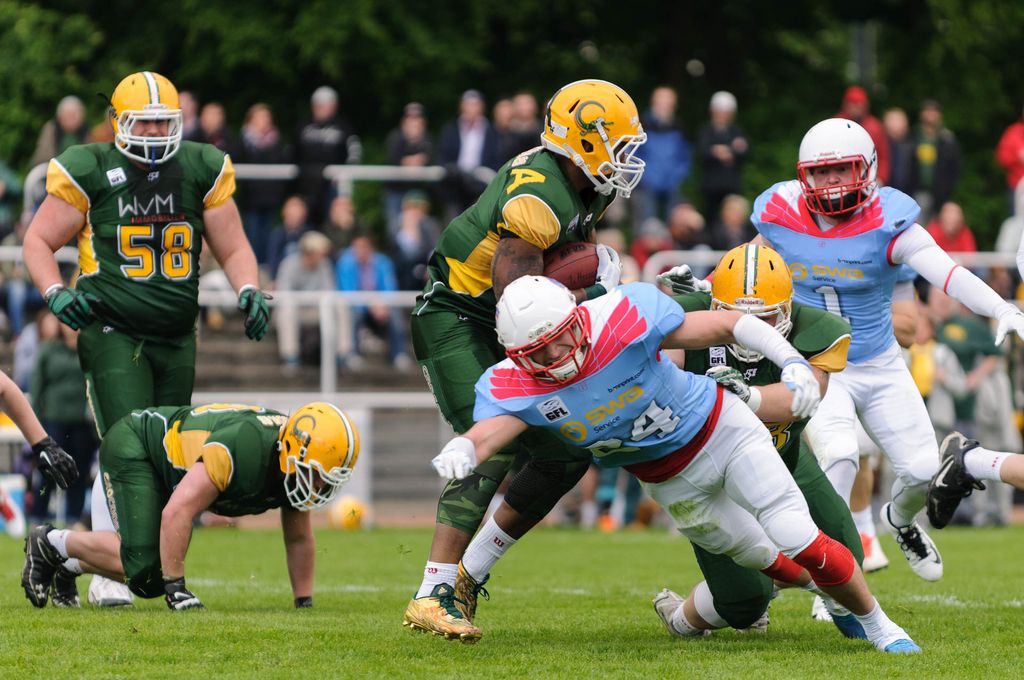 Nach einem punktlosen ersten Viertel änderte sich das Bild auch im zweiten nicht wesentlich. Die Abwehr übte jeweils genügend Druck auf die Angriffsreihen aus um diese immer wieder zu zwingen, sich per Punt vom Angriffsrecht zu trennen. Kurz vor Ende der ersten Halbzeit war es dann endlich den Angriffsbemügungen der Hausherren um den erneut mit Übersicht gut aufspielenden Quarterback Joao Krapohl vergönnt, durch einen kraftvollen Lauf von James Langford III mit einem Touchdown die ersten Punkte des Tages zu markieren. Der Extrapunktversuch wurde jedoch leicht verzogen, so dass dieser am Gestänge vorbeitrudelte. Mit 6:0 ging es somit für beide Teams in die Kabinen.
