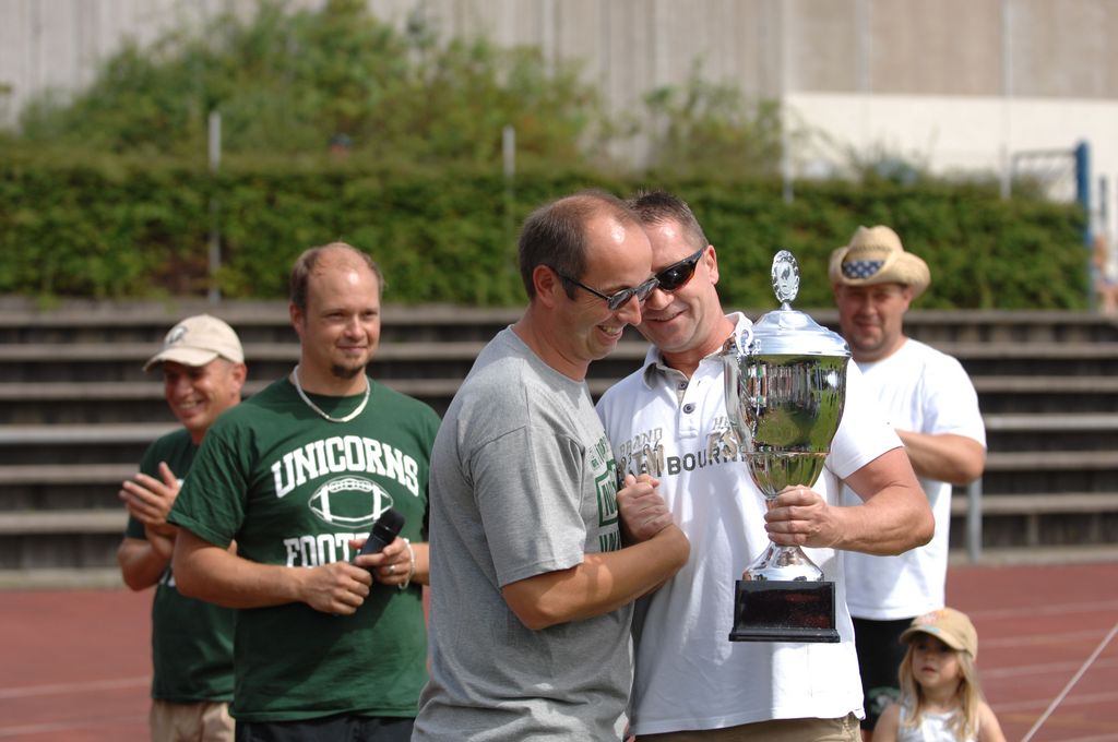 Bereits vor zwei Wochen durften sich die Schwäbisch Hall Unicorns über den Meistertitel in der GFL-Süd freuen. Letzten Sonntag konnten sie im Rahmen ihres Fan- und Family-Days im Hagenbachstadion dann auch den Meisterpokal in Empfang nehmen. Überbracht wurde dieser von Andreas Stehle, dem Vorsitzenden des American Football Verbandes Baden Württemberg in Vertretung für den Bundesverband AFVD.