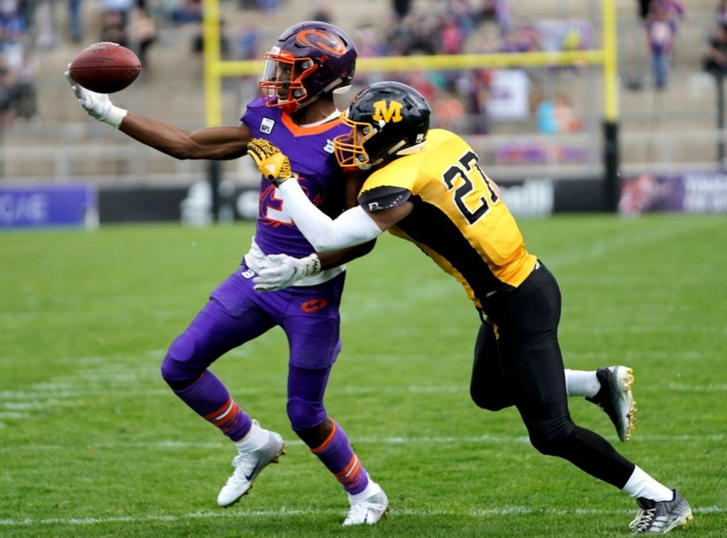 Auch im dritten Spiel blieben die Men in Purple siegreich, auch wenn es in den letzten 6 Minuten noch einmal richtig spannend wurde. Im ersten Quarter hatten beide Teams noch mit Anlaufschwierigkeiten zu kämpfen, die Gäste brachten mit einem 28 Yard Fieldgoal von Robert Werner die ersten Punkte auf die Anzeigentafel 0:3.