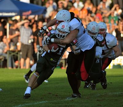 Die Haller Defense zeigte hingegen von der ersten Spielminute an eine sehr starke Leistung, die ihr im Vorfeld nur wenige zugetraut hatten. Der Mavericks-Angriff biss sich an den Haller Verteidigern phasenweise geradezu die Zähne aus und auch der auffälligste Maverics-Angreifer John McCardle hatte seine liebe Not mit den Schützlingen von Halls Defense-Coordinator Andreas Wengertsmann. Am Ende hatte die TSG-Defense mit zwei Touchdowns von Gerhard Jäger und Jonathan Ziegner sogar maßgeblich zu den 47 Haller Punkten beigetragen.