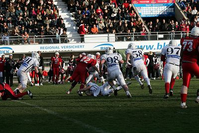 Um 16:00 Uhr empfangen die Marburg Mercenaries im Georg-Gassmann-Stadion die Berlin Adler. Während die Adler bereits zwei reguläre Spiele erfolgreich hinter sich gebracht haben, konnten die neuformierten Mercenaries zwei Gelegenheiten zu Vorbereitungsspielen allerdings ebenso erfolgreich nutzen. Einem allerdings zähen Auftakt für die Mercenaries beim 36:25 gegen die Montabaur Fighting Farmes, folgte ein ungefährdeter 48:7 Auswärts-Sieg gegen die Düsseldorf Panther. Ganz anders die Adler, die sowohl das EFAF-Cup Spiel gegen die Amsterdam Crusaders als auch das Auftaktspiel der GFL-Nord bei den Cologne Falcons, wenn auch sehr glücklich mit 3:0, gewannen. Die letzte Begegnung der beiden Teams datiert vom 18.09.2005. In einem spannenden Spiel gingen die Marburger verdient mit 40:21 Sieger vom Platz und zogen in das Halbfinale zum German Bowl XXVII ein.