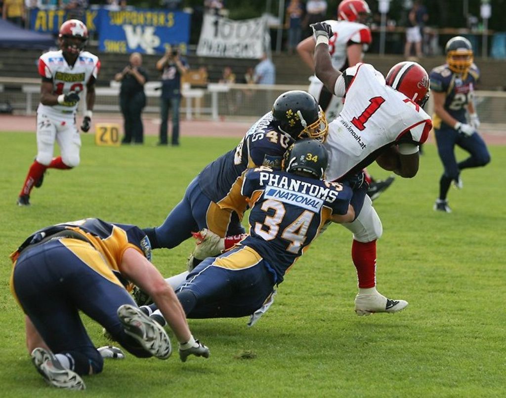 Nein, denn wie ausgewechselt kehrten die Mercenaries aus der Kabine zurück aufs Feld und demonstrierten eindrucksvoll, dass sie nicht willens waren, beim Underdog zu verlieren. Joe Clark, der nahezu die Hälfte aller offensiven Spielzüge bestritt, sorgte schon in der Angriffsserie seiner „Söldner“ für den Ausgleich. Die Gäste wirkten in der zweiten Halbzeit homogener, konzentrierter, während sich bei den Phantoms nach der tollen Vorstellung des ersten Spielabschnitts mehr und mehr Nachlässigkeiten einschlichen. Die Angst vor Fehlern bestimmte zunehmend das Agieren. Die Unbekümmertheit, mit der man die Gäste vor der Pause gleich mehrmals in Verlegenheit brachte, ging verloren. Die Mercenaries spielten nun so, wie man es vom Favoriten erwarten konnte, abgeklärt und fokussiert, während „wir uns irgendwie selbst unter Druck gesetzt haben und dadurch verkrampften“, bemerkte es auch Geburtstagskind Dominik Voigtländer nach dem Spiel. Denn auch seine Laufwege wurden mit zunehmender Spieldauer enger und kürzer. Die aggressive Marburger Defense ließ kaum noch nennenswerten Raumgewinn zu.