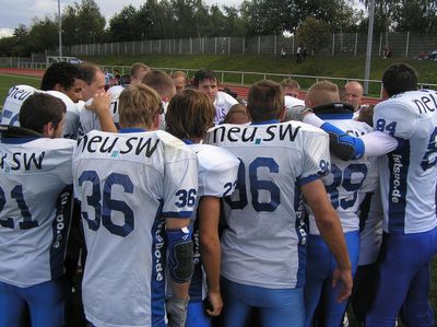 Schnell ging man in Führung und baute diese bis zur Halbzeit zum 30:6 aus. Der gefürchtete Berliner Quarterback war Dank hervorragender Defensefast ständig unter Kontrolle. Er war es auch, der den Ehren Touch Down erzielte. Setzte dieser die Frankfurter bei deren Niederlage gegen die Bears noch mächtig unter Druck, so stand er auf dem Datzeberg ständig unter selbigem. Die beiden hervorragenden EndŽs Ch. Wolff und Ehlert waren stets auf der Jagd nach ihm. Auch der Rest der Verteidigung glänzte. Kapitän Baierl fügte seiner Saison Statistik eine weitere Interception hinzu und auch Hannes Thode fing 2 mal gegnerische Bälle ab. Im Gegensatz zur Vorwoche brillierte diesmal auch die Offense. In die Scorerliste schrieben sich Quarterback Thode mit 2 Touch Downs und Dietzel, Mansfeld, Gau und Th. Barsch ein. Thomas barsch in seiner 1. Saison wird wohl die Krone des Besten Neulings der Saison ergattern. Er fing insgesamt 8 Pässe für mehr als 200 Yards. 2 Mal wurde er nach weitem Raumgewinn erst kurz vor der Endzone gestoppt und einmal punktete er nach einem 70 Yards Catch. Doch dies war nur durch die genauen Pässe von Quarterback Hannes Thode und dessen guten Schutz durch die Offense Line (Berglöf, Manske, Hanack, Wenghöfer, Schulze) möglich. Weiterhin enorm verbessert zum Frankfurt Spiel hatten sich die Running Backs Ginuth und Granzin. Ebenso erfreulich ist die Rückkehr von Mattes Gramke als Ballträger. Weitere Punkte erzielten Matze Karwe (5) und Marcus Wolff (4) in Extra Punkten und Field Goals. Auszeichnen konnte sich auch Max in seinem ersten Speil mit 2 sehenswerten Tackles in den Special Teams. Lange ausruhen können die Raubfische aus dem Tollensesee sich nicht, denn in der nächsten Woche müssen sie dann bei den Bears in Berlin ran. Saison Finale ist dann am 12. 9, gegen die Leipzig Lions mit einer zünftigen Stadion Einweihung und einem weiteren Sieg.
