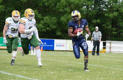 Doppelschlag aber gleich nach der Pause. Erst setzte Jaleel Awini zum Kickoff-Return an, trug den Ball spektakulär die Seitenlinie entlang und punktete in der Endzone. Dann entriss Safety Jeff Juurlink seinem Gegenspieler den Ball und legte damit den Grundstein für Nate Morris zweiten Touchdown - nach Pass von Therriault. Davon erholte sich Köln nicht mehr.