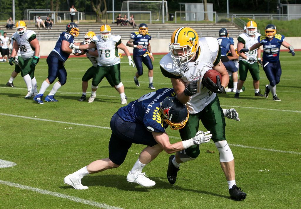 So ist die Geschichte des Spiels schnell erzählt. Die Gäste aus Köln gingen früh durch ein Fieldgoal mit 0:3 in Führung und fingen noch im ersten Viertel einem Ball ab, der anschließend in der Essener Endzone landete. Als die Cardinals vor der Halbzeit auf einem guten Weg waren, den Ball endlich in die gegnerische Endzone zu bekommen, landete der Ball erneut in den Armen des Gegners, der unmittelbar danach auf 0:17 erhöhen konnte.