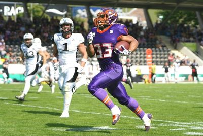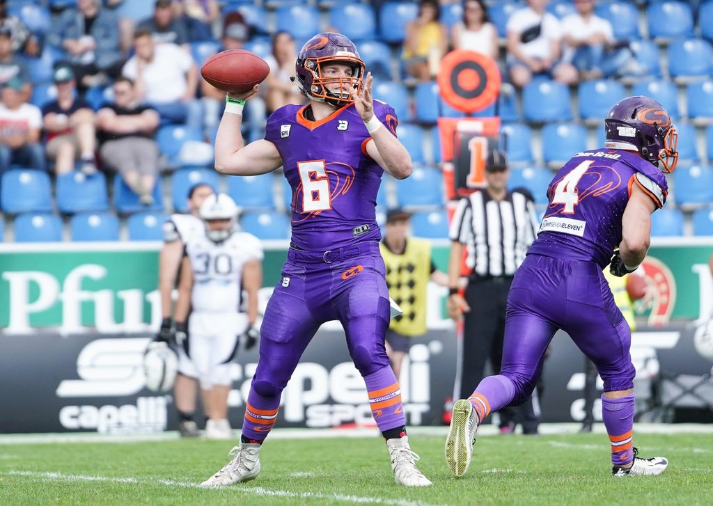 Mit den beiden Runningbacks Justin Rodney und Oscar Nevermann erliefen die Frankfurter insgesamt 316 Yards, dabei hatte der „Purple Warrior“ Rodney mit seinen beiden aufeinander folgenden Touchdownläufen über 65 und 70 Yards den größten Anteil. Rodney trat bereits zweimal in der RTL Show „Ninja Warrior“ auf und zeigte an diesem Tag, das er ein echter Warrior ist. George Robinson fing dann noch einen TD Pass und da Duis auch im zweiten Quarter alle 3 Kicks sicher verwandelte ging es mit 42:7 in die Halbzeit.