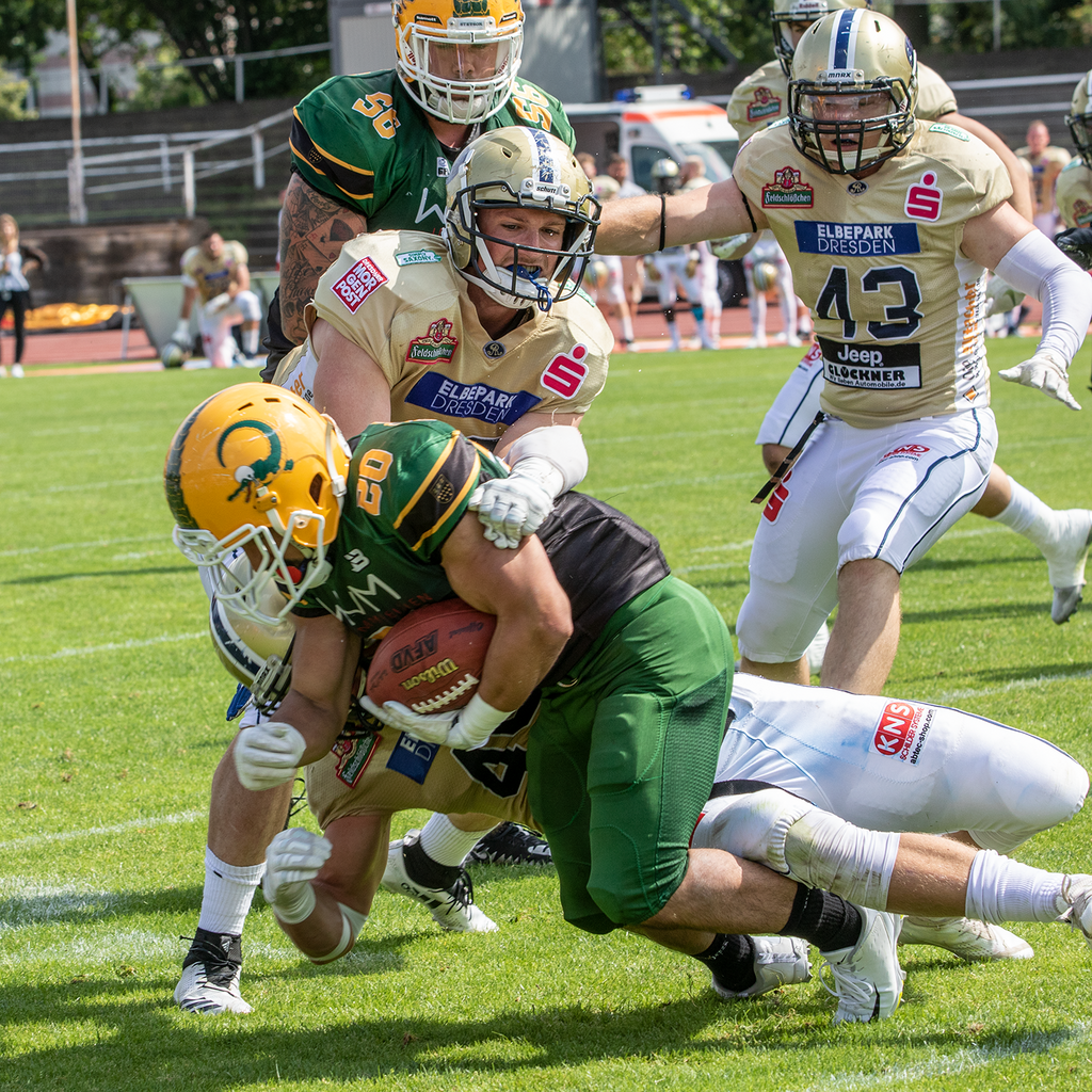 Im letzten Spielviertel mussten sich die Gäste also wieder per Punt vom Ball trennen. Dresdens ihrerseits machte es – zwischenzeitlich mit ihrem weiteren US Quarterback Glen Cuiellette besser. Durch eigene Läufe und erfolgreichem Passspiel warf er im siebten Spielzug über insgesamt 90 Yards seinen Empfänger KeVonn Mabon für die letzten 33 Yards nach nur etwas über drei Minuten zum abschließenden und jetzt doch deutlichen 35:0.