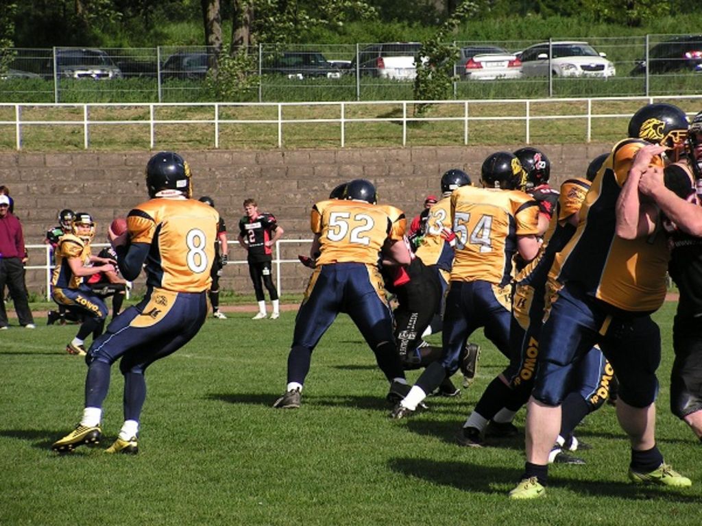 Zu Beginn der zweiten Halbzeit schienen die Frankfurter die Defense der Lions gut im Griff zu haben und erhöhten zweimal auf 13:12 und dann auf 20:12. Offensecoach Mike Weymann musste also etwas unternehmen und schickte Neu-Quaterback Johannes Hoppe (#5) auf das Feld, der den Ball dann auch prompt auf Daniel Teubert passte, was zu einem weiteren Touchdown für die Lions führte sowie einer Two-Point-Conversion durch Dominik Hahn (#88). Neuer Stand 20:20.
