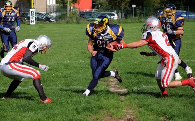 Nachdem der Tag mit strömendem Regen in Leipzig begonnen hatte, erwartete die Lions in Berlin im DeGeWo-Stadion strahlender Sonnenschein. Das gute Wetter gab dabei offensichtlich vor allem Josef Fuss Anschub zu großen Taten, denn der Wide Receiver mit der Nummer 80 glänzte gleich im ersten Quarter mit einem Touchdown und legte dann schnell einen zweiten nach. Der dritte Touchdown durch Riccardo Posselt (#12), ließ die Lions mit einem Stand von 21:06 in die Halbzeit gehen.