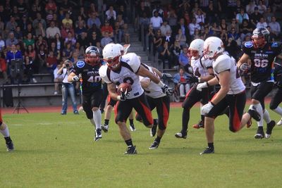 Vor 3580 Zuschauern spielten die Mavericks vor allem in der ersten Halbzeit die Düsseldorfer fast schon an die Wand. Den Grundstein legte ein geblockter Punt. Mavericks US Verteidiger Adam Goloboski eroberte den geblockten Punt und trug ihn zur Mavericks Führung in die Endzone der Düsseldorfer. Danach war es wieder John McCardle, der in seiner schon unheimlichen Art wieder der gegnerischen Verteidigung auf und davon lief. 14:00 der Spielstand mit dem ging es dann in den zweiten Abschnitt. Durch einen weiteren Touchdown - Colin Clancy bediente Christoph Würtz - lagen die Mavericks bis zue Halbzeit mit 21:0 in Front.