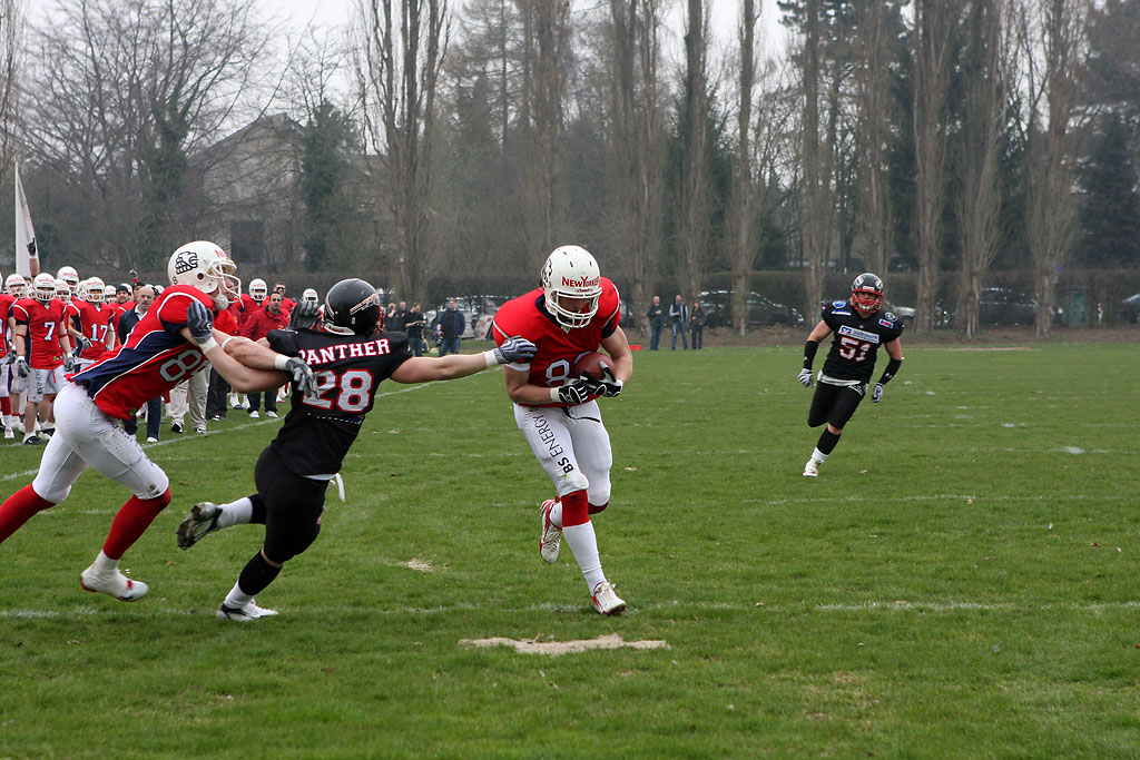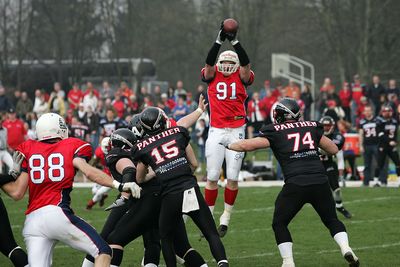 Den ersten Defense-Höhepunkt des Tages lieferte wieder nur kurze Zeit später Patrick Finke, der einen Pass der Düsseldorfer Quarterbacks Fabian Schorn abfangen konnte und in die Endzone der Panther zurücktrug.