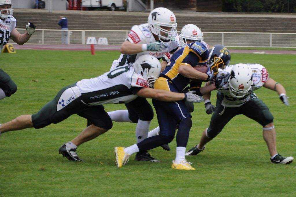 Der 14:40-Halbzeitstand ließ vermuten, dass sich die Haller in der zweiten Hälfte ein wenig zurücklehnen können würden – sollten die feststehenden Nationalspieler womöglich schon geschont werden? Derartige Planungen lösten sich schnell in Luft auf, als Wiesbaden energiegeladen aus der Kabine kam und ihren ersten Drive gleich in Punkte verwandeln konnten. Gegen Duft und die anderen Spielmacher der Phantoms sah die Defense des Tabellenersten ein um das andere Mal schlecht aus. Auch beim zweiten Wiesbadener Angriffszug, nachdem Halls Offense das erste Mal an diesem Tag nicht in die Endzone erreicht hatte, waren die Phantoms schnell vor der Unicorns-Endzone. Und diesmal war es Kevin Brüngel selbst, der den Ball dort zum 28:40 unterbrachte. Die Unicorns hatten es geschafft: Die wenigen mitgereisten Fans erlebten das erste spannende Spiel seit der Saisonpremiere in Berlin. Und sie machten es noch dramatischer. Brian Rushing verlor den Ball an die Phantoms (Fumble) und Wiesbaden bestrafte diesen Fehler mit dem nächsten Touchdown. Aus dem einstmaligen 26-Punkte-Vorsprung machte der Aufsteiger fünf!