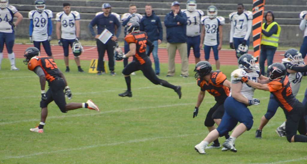 Die Offense Reihen beider Mannschaften zeigten spektakuläre Drives im Minutentakt und bereits nach dem ersten Viertel stand es 21:14 für die Hausherren. Es würde in diesem Spiel wohl darauf ankommen welche Defense sich als erste auf die Angriffe des Gegner einstellt und diese stoppen kann. Im 2 en Viertel konnte man bereits erkennen, dass es heute die Defense der München Rangers sein würde. Nach jeder Führung der Rangers gelang den Spiders zwar noch der Ausgleich, aber das Vorwärtskommen wurde für die Straubinger immer zäher und die Defense der Rangers machte den Spiders das Leben immer schwerer. Jetzt konnten die Rangers ihre Führung nochmals auf 41:28 ausbauen. Nach einem Fumble der Straubing Spiders schnappt sich Linebacker Dennis Kunze den Ball und sprintet sensationell über 70 Yards zum 48:28 der Münchner. Durch eine Interception von Lucky Dozier kurz vor dem Halbzeitpfiff können die Rangers dann auch verdient mit einem 48:28 Vorsprung in die Pause gehen.