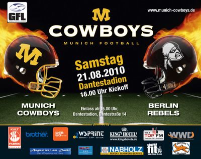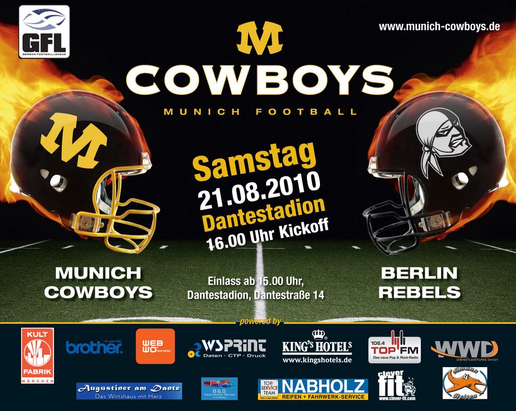 Die Munich Cowboys rechnen sich Chancen gegen die Berlin Rebels aus. Zwar haben wir zum Saisonstart in Berlin eine Niederlage einstecken müssen, erklärt Head Coach Phil Hickey, doch haben wir wirklich enorme Fortschritte gemacht und das Team ist nun durch die jüngsten Neuzugänge aus den Reihen der MC Juniors noch einmal sehr gestärkt worden. Fast 15 Spieler sind im Laufe der Saison von den MC Juniors ins GFL-Team rekrutiert worden. Jugendcoach Florian Berrenberg hat hervorragende Spieler geformt, betont MC Präsident Werner L. Maier, wir sind sehr stolz auf unsere erfolgreichen Junioren, die ja erst vor kurzem zum 10. Mal bayerischer Meister wurden, und freuen uns sehr, dass unser Konzept ein GFL-Team von innen heraus aufzubauen, mehr und mehr aufzugehen scheint.