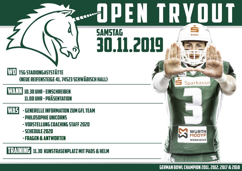 Einschreiben für das Open Tryout der Unicorns kann man sich am 30. November ab 10:30 Uhr in der TSG-Stadiongaststätte (Neue Reifensteige 41 in Schwäbisch Hall). Ab 11:00 Uhr informiert Jordan Neuman über das GFL-Team, die Philosophie der Unicorns und die Planungen für die Saisonvorbereitung 2020. Um 11:30 Uhr beginnt dann das Training mit Ausrüstung auf dem Kunstrasenplatz neben dem Hagenbachstadion.