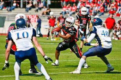 Direkt im Anschluss war es wieder die Defense der Braunschweiger, die für Aufsehen sorgte. J. Henderson erkannte bereits im Ansatz einen Pass des Essener Quarterbacks L. Lee, fing diesen ab und trug den Ball bis an die 30 Yard Linie der Cardinals zurück. Aus der guten Feldposition konnte der Braunschweiger Angriff aber kein Kapital schlagen und musste sich schließlich per Punt vom Ball trennen. Die Cardinals witterten Morgenluft und drehten nun auf, immer wieder war es besonders Runningback Jimmy Lee Malone, der nun für Raumgewinn der “Men in Blue“ sorgte. Knapp zwei Minuten vor der Halbzeitpause hatten sich die Cardinals so bis vier Yards vor die Endzone der New Yorker Lions nach vorne gekämpft.