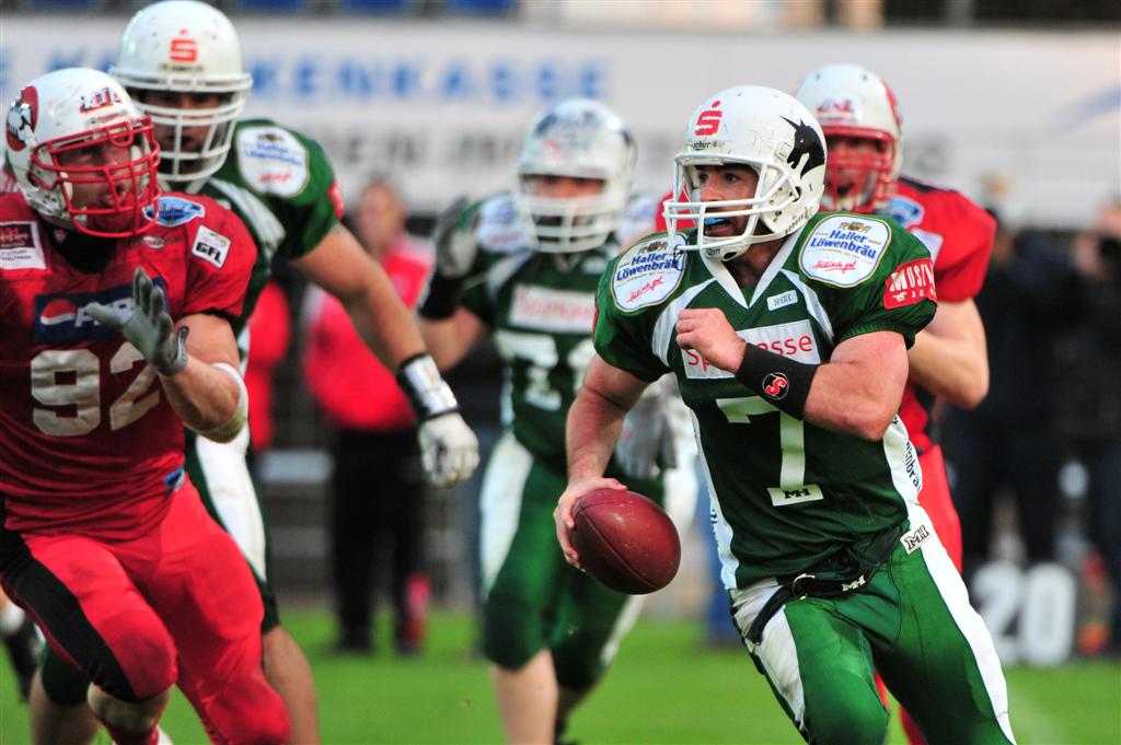 Der Nieselregen zu Beginn des Spiels erschwerte beiden Angriffsreihen das Passspiel, so dass mehr auf den Lauf gesetzt wurde. Bei einem Laufversuch erzwang Sidney Braun allerdings einen Ballverlust von Scorpions-Quarterback Ira Vandever, den Thomas Rauch für die Unicorns an der Stuttgarter 19-Yard-Linie sichern konnte. Kurz darauf gelang Jordan Neuman ein 9-Yard-Lauf in die Stuttgarter Endzone zur 6:0-Führung für Hall. Die geplante 2-Point-Conversion durch einen Trickspielzug scheiterte jedoch.