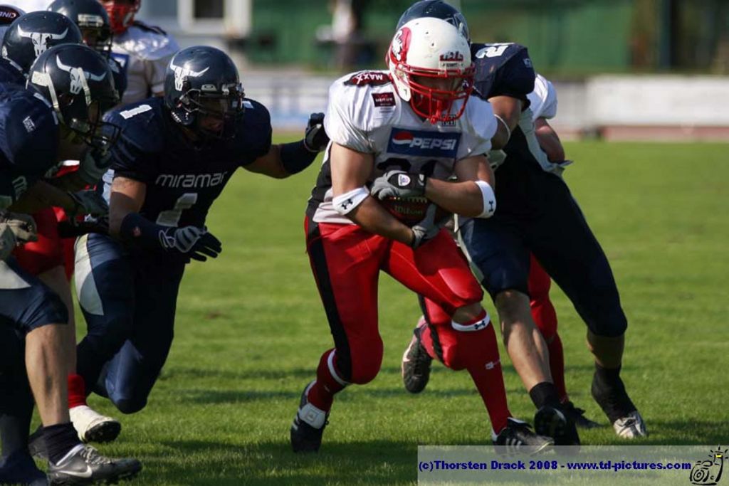 Nachdem im Anschluss daran beide Teams punten mussten, war es - nun bereits im zweiten Viertel - TE Gunter Braschler, der im nächsten Angriff mit einem 30y-pass von Vandever die Scorpions bis zur 18y-Line der Hausherren brachte. Von dort aus fand Vandever dann WR Marvin Thiel, der seinen Größenvorteil nutzte und mit seinem Passfang in der Weinheimer Endzone auf 13:0 (TPC misslun-gen) erhöhte. Noch vor der Pause konnte Wurster mit einem Fieldgoal aus 25y auf 16:0 erhöhen, während die weiteren Angriffsbemühungen der Longhorns durch eine Interception von CB Chris Wol-lin vereitelt wurden.