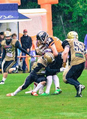 Pünktlich zum Kickoff erreichte die Zentrale Sportanlage Atter in Osnabrück ein Gewitterschauer und das Spiel wurde darum um 20 Minuten verschoben. Die Raubkatzen präsentierten sich in guter Form und gingen souverän mit drei Touchdowns in der ersten Hälfte in Führung. Die Seals Offense hingegen mußte immer wieder durch einen Punt das Angriffsrecht abgeben, sodass die Goldhelme zur Pause mit 21:0 hinten lagen.