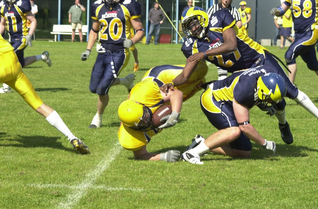Das Invaders Senior Team um die beiden Coaches René Dittmann und Winston Huggins ging sehr gut vorbereitet in das Spiel gegen die Elmshorner. Aus den vergangenen Jahren wissen die Hildesheimer nur zu gut, dass die Nord Hamburger zu keiner Zeit zu unterschätzen sind. Mit einem knappen 14:15 verloren die Invaders das letzte Aufeinandertreffen in der buchstäblich letzten Sekunde. Dieses Jahr sollte es anders werden. Obwohl die Hildesheimer aus ihrem ersten Angriffrecht keine Punkte verbuchen konnten, kamen die Mannen um Quarterback Marco Lutz recht gut ins Spiel. Kicker Arnd Probst brachte die Invaders mit einem 30 Yards Fieldgoal in Führung. Die Defense erwischte wieder nicht ihren besten Tag, aber hielt, wenn auch etwas glücklich, über das gesamte Spiel hinweg. Vier Interceptions (Abgefangener Ball) und ein recoverter Fumble (Freier Ball) brachten immer wieder die Offensive der Invaders aufs Feld, die mit leichten Abstimmungsschwierigkeiten zu kämpfen hatte. Receiver Sven Wille war es der einen Ball von Nicolai Alex fing und über 50 Yards in die Endzone trug. Arnd Probst verschoss zwar den Extrapunkt, machte es aber nach dem 15:00 Touchdown Pass von Lutz auf Alex besser und erhöhte zur 16:00 Pausenführung.