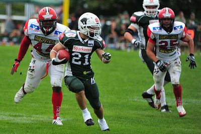 Weil nicht nur Hannes Dierolf sondern auch Jonathan Ziegner und Oliver Radke je einen Pass von Nationalquarterback Joachim Ullrich abfingen, konnte sich die Unicorns-Offense nicht über Langeweile beschweren. Die TSG-Angreifer ließen nur wenige Chancen aus und lagen schonzur Halbzeit fast uneinholbar mit 37:0 in Führung.
