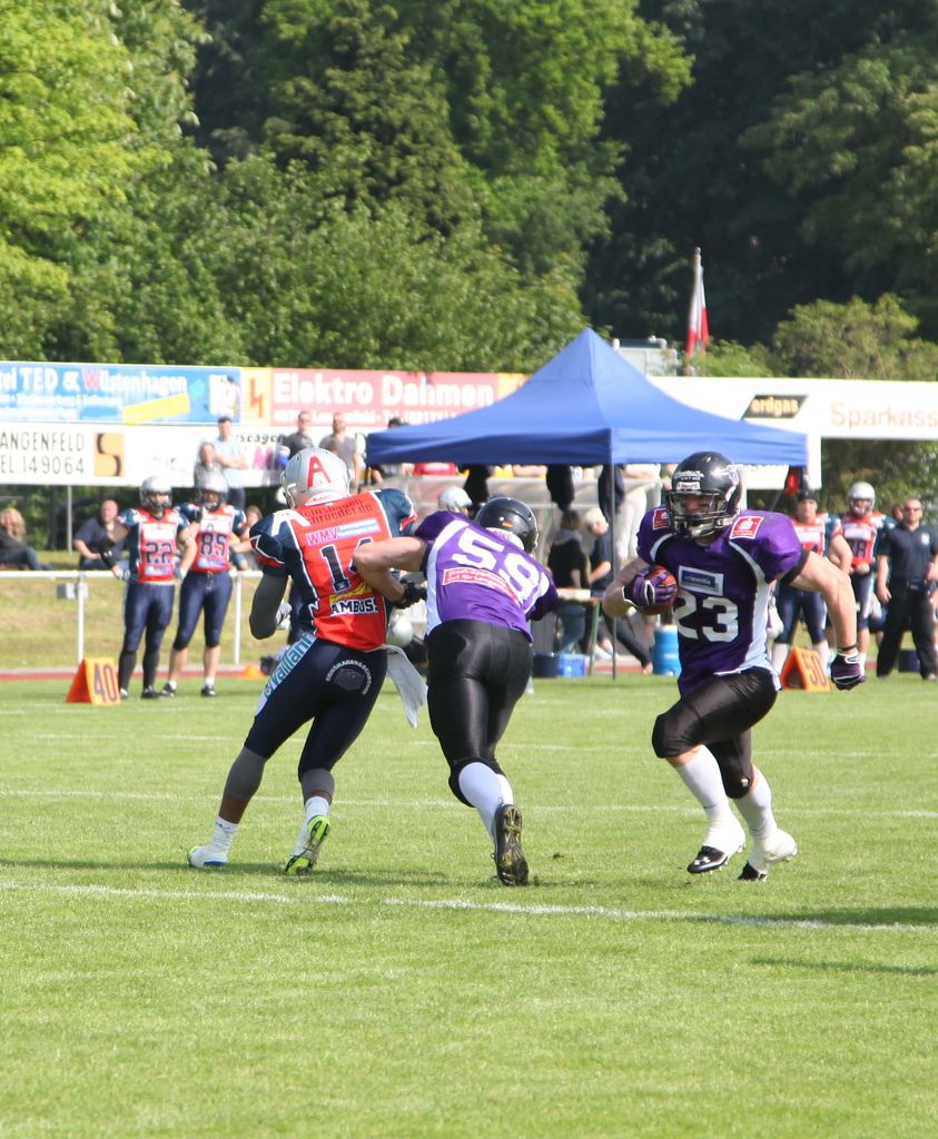 Bereits mit dem ersten Spielzug trumpfte Marcel Kirchner auf und überraschte das Kickoff-Return-Team des Amboss mit einem Onside Kick (selbst zurückeroberter Kickoff). Diesen konnte sich Nico Lüdtke sichern und gab somit der eigenen Offense das Ballrecht. Im weiteren Verlauf des ersten Viertels konnte Kirchner seinen ersten von zwei Touchdown-Pässen fangen (Extrapunkt Kirchner). Früh im zweiten Quarter konnte Daniel Berg mit einem Touchdown begeistern, bei dem er mit einem Sprung über den fast aufrechten Remscheider Safety Patrick Giesa die Endzone erreichen konnte (Extrapunkt Kirchner). Die Langenfelder Defense lies kaum Raumgewinn zu. Nachdem Poetsch durch einen Langenfelder Spieler forciert einen Ball fallen ließ, konnte man im weiteren Spielverlauf durch eine Fumble Recovery das Ballrecht für die Langenfelder Offense zurückerobern. Diese nutzte die Gelegenheiten um den Punktestand zu erhöhen. Erst sorgte Michel Fritsche durch einen Lauf in die Endzone für Punkte (Extrapunkt Kirchner) und später fand er mit einem weiteren Touchdown-Pass André Hoffmeister, der die verbleibenden 25 Yards bis zur Goalline durch einen starken Lauf überbrückte (Extrapunkt Kirchner). Kurz vor Ende der Halbzeit konnten die Gäste den Punktestand mit einem kurzen Pass von Oliver Schidzig auf Keron Phelps auf 28:7 verkürzen (Extrapunkt Schidzig).