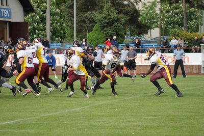 Danach wurde der Angriff besser, die Spielzüge funktionierten wieder und Dalvin Carr verkürzte kurz vor Ende des ersten Viertels mit einem spektakulären Lauf über 30 Yards auf 6 – 13, Tim Neuner verwandelte den folgenden Extrapoint sicher.