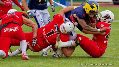 Mit 37:0 gewannen sie vor 3521 niedersächsischen Footballfans im Hildesheimer Friedrich-Ebert-Stadion. Die Hildesheimer erwischten einen rabenschwarzen Tag und mussten obendrein die Ausfälle von Viktor Bürger und Casey Therriault verkraften. Den Lions reichte am Ende eine überragende erste Halbzeit.