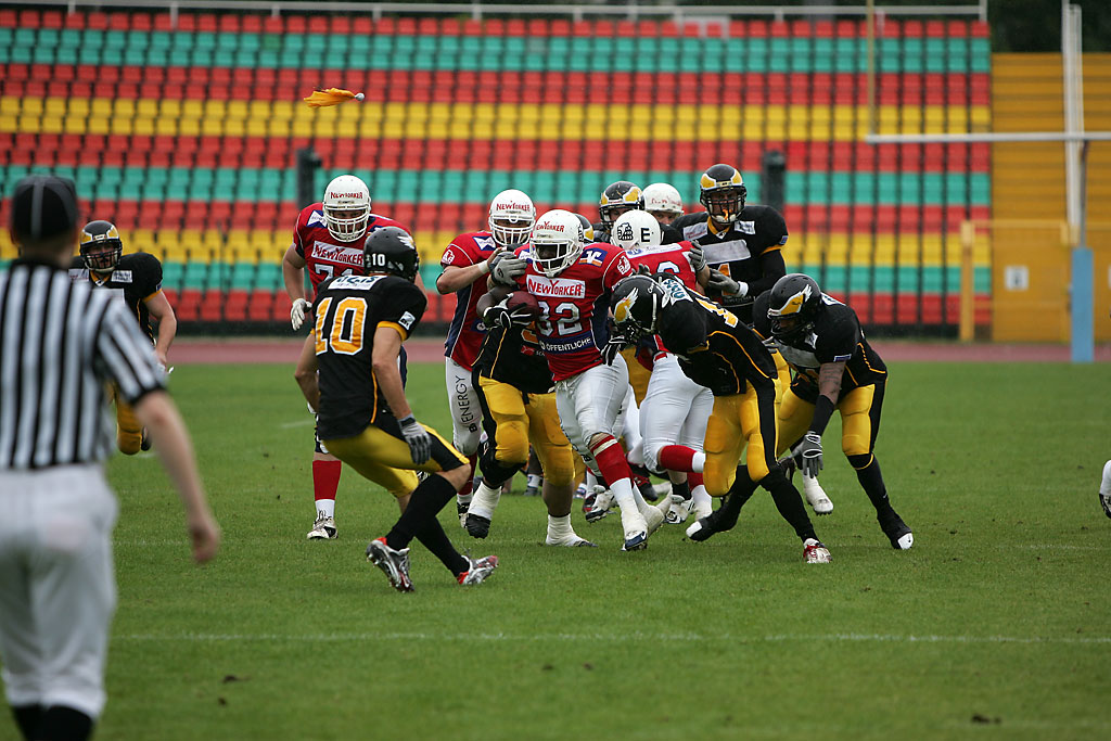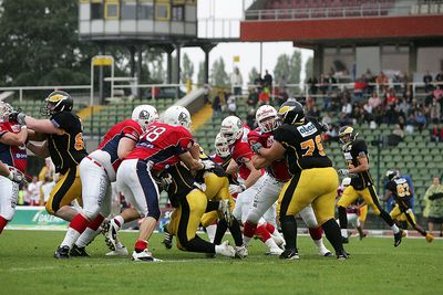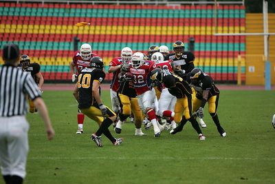 Und wurde einmal viel versprechender Raumgewinn erzielt, so wurden diese Spielzüge zumeist durch Strafen und die dadurch bedingten Raumverluste wieder zunichte gemacht. Am Spielende standen bei den Lions 170 Yards an Strafen zu Buche, bei den Berlinern 140 Yards. Im Nachhinein war das aus Sicht der Gäste zuviel, um die starke Adler-Defense auf Dauer attackieren und unter Druck setzen zu können.