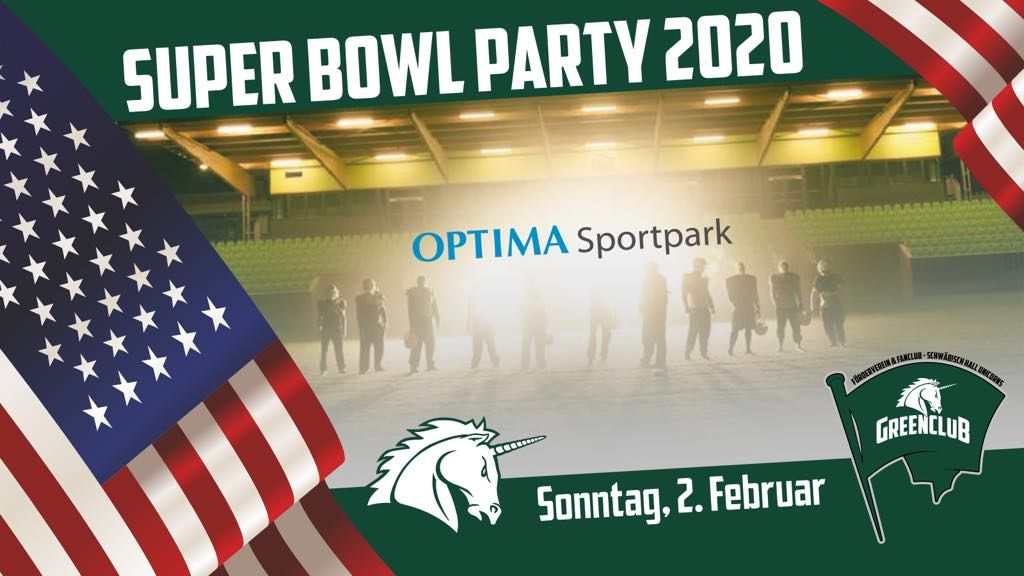 Footballfans in Schwäbisch Hall und Umgebung können das wichtigste NFL-Spiel des Jahres bei freiem Eintritt in der Sparkassen Business Lounge im Haller Optima Sportpark verfolgen. Neben der Live-Übertragung wird ein interessantes Rahmenprogramm geboten. Geplant sind Interviews mit Unicorns-Headcoach Jordan Neuman und Spielern aus dem Haller GFL-Team, von denen es die ersten Ausblicke auf die bevorstehende Saison 2020 geben wird. Beim traditionellen Tippspiel wird es nach jedem Quarter tolle Preise zu gewinnen geben, darunter auch VIP-Tickets für ein Unicorns-Heimspiel. Der Erlös daraus kommt der UNICORNS-Jugend zugute.