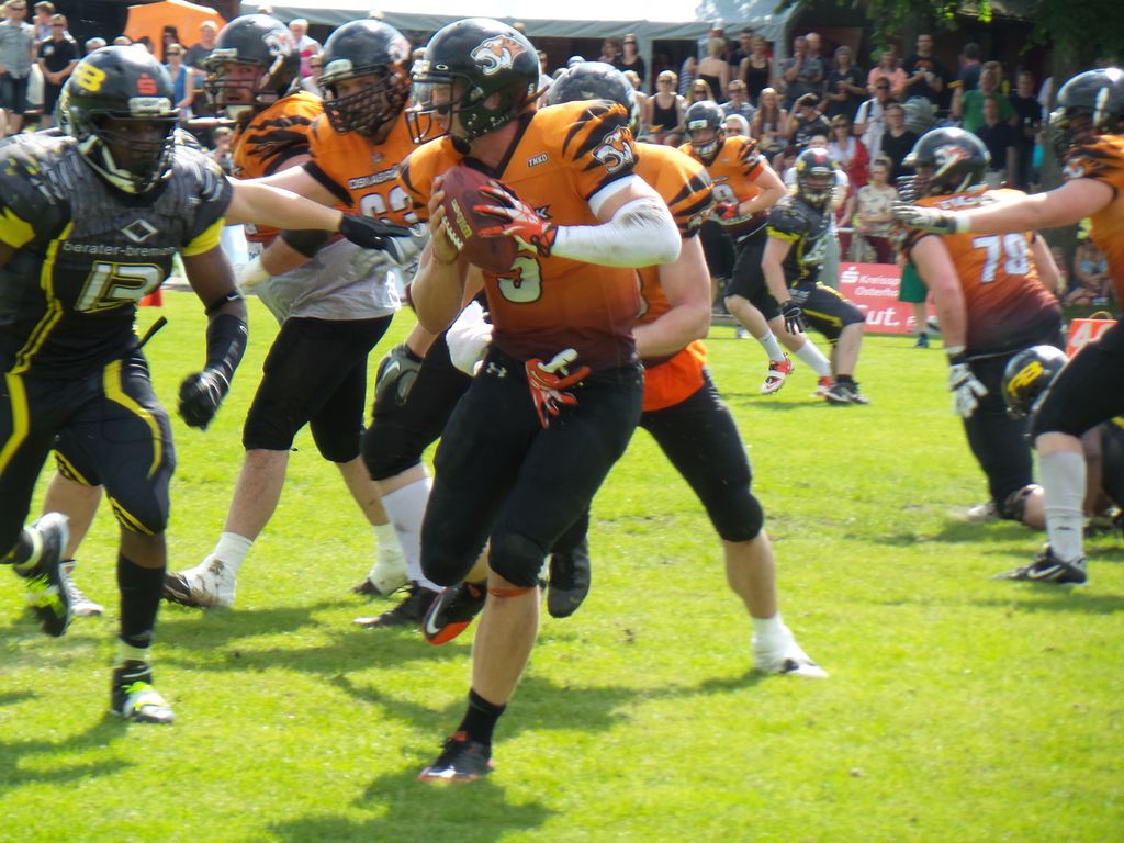Immer wieder setzte die Badgers-Defense den Osnabrücker Quarterback Joshua Dean unter Druck. Der ließ sich davon aber nicht beirren. Immer wieder nahm er sein durchsetzungsstarkes Spiel auf. Den nächsten Drive der Osnabrücker beendete er mit einem Touchdownlauf für 12 Yards. Dean sorgte mit einem zweiten Lauf in die Endzone für zwei Zusatzpunkte und dem 8:3-Vorsprung der Tigers.